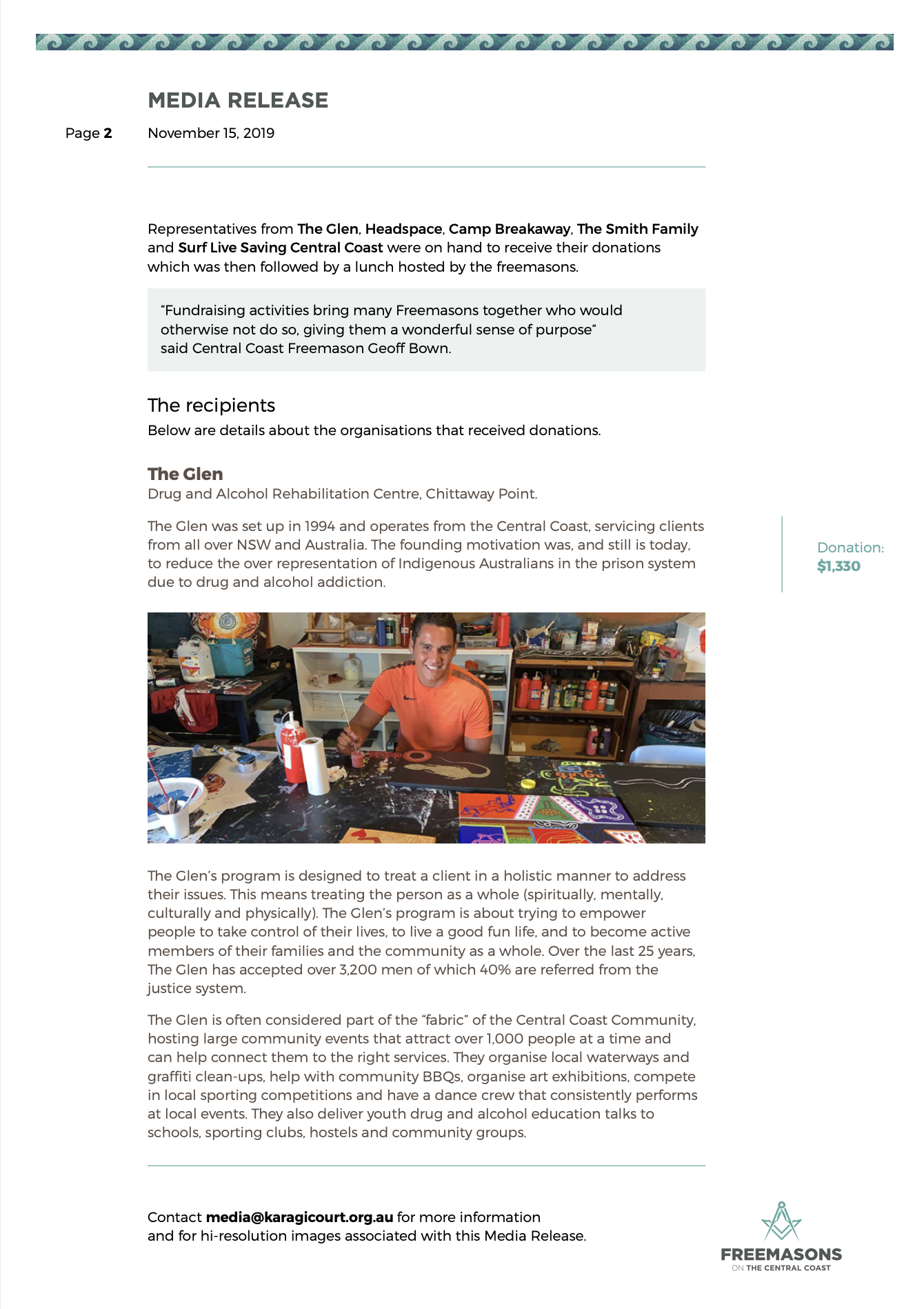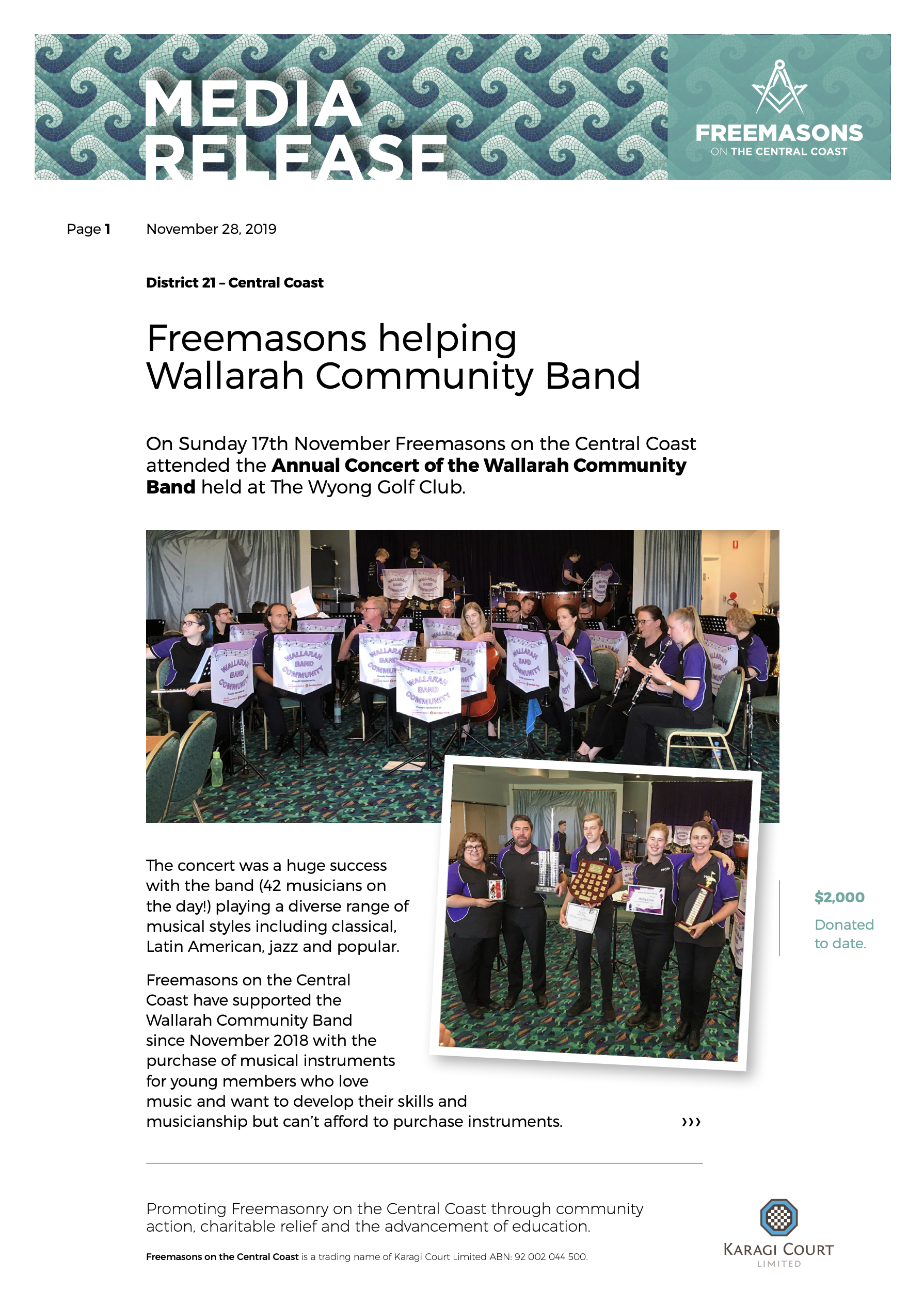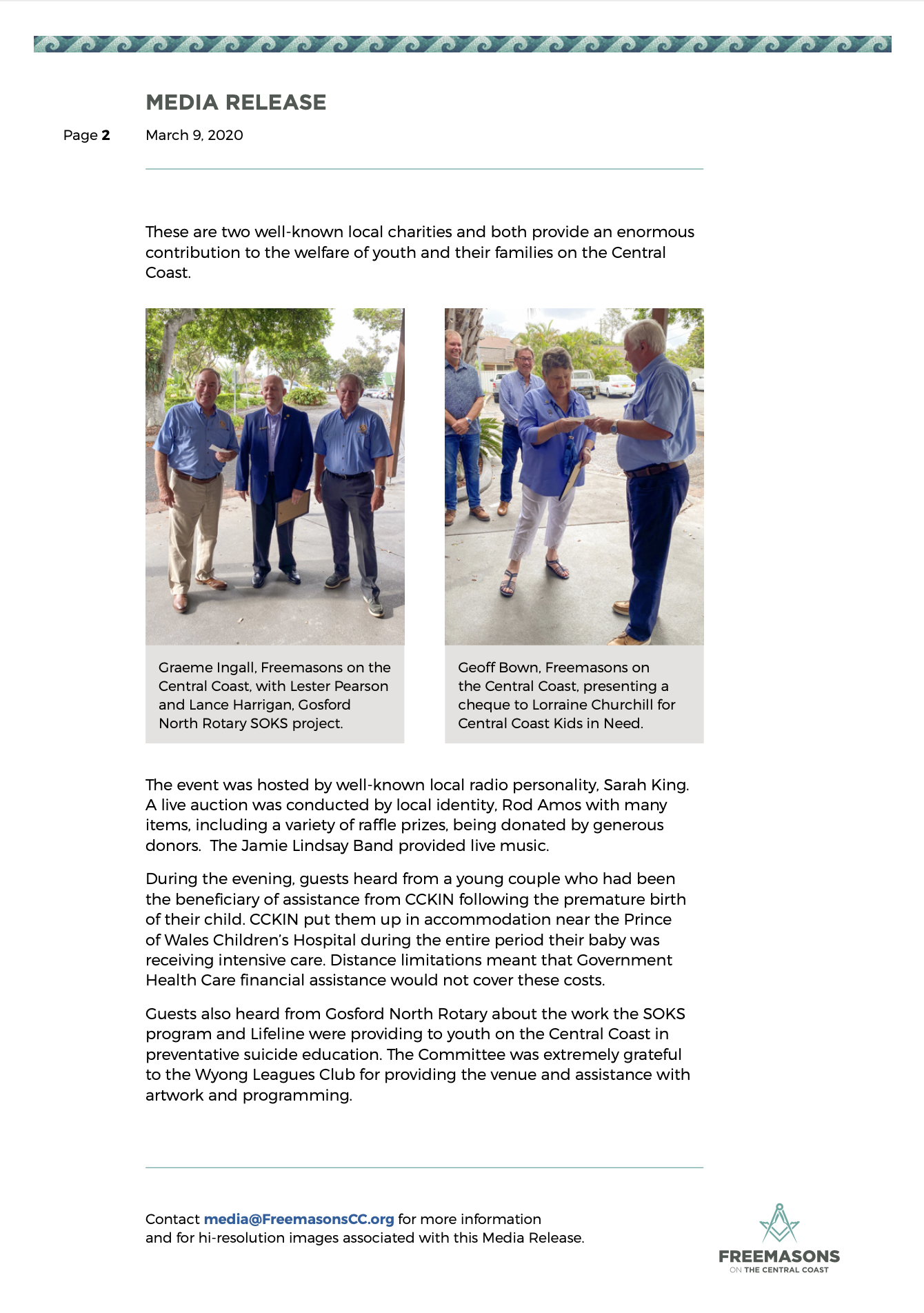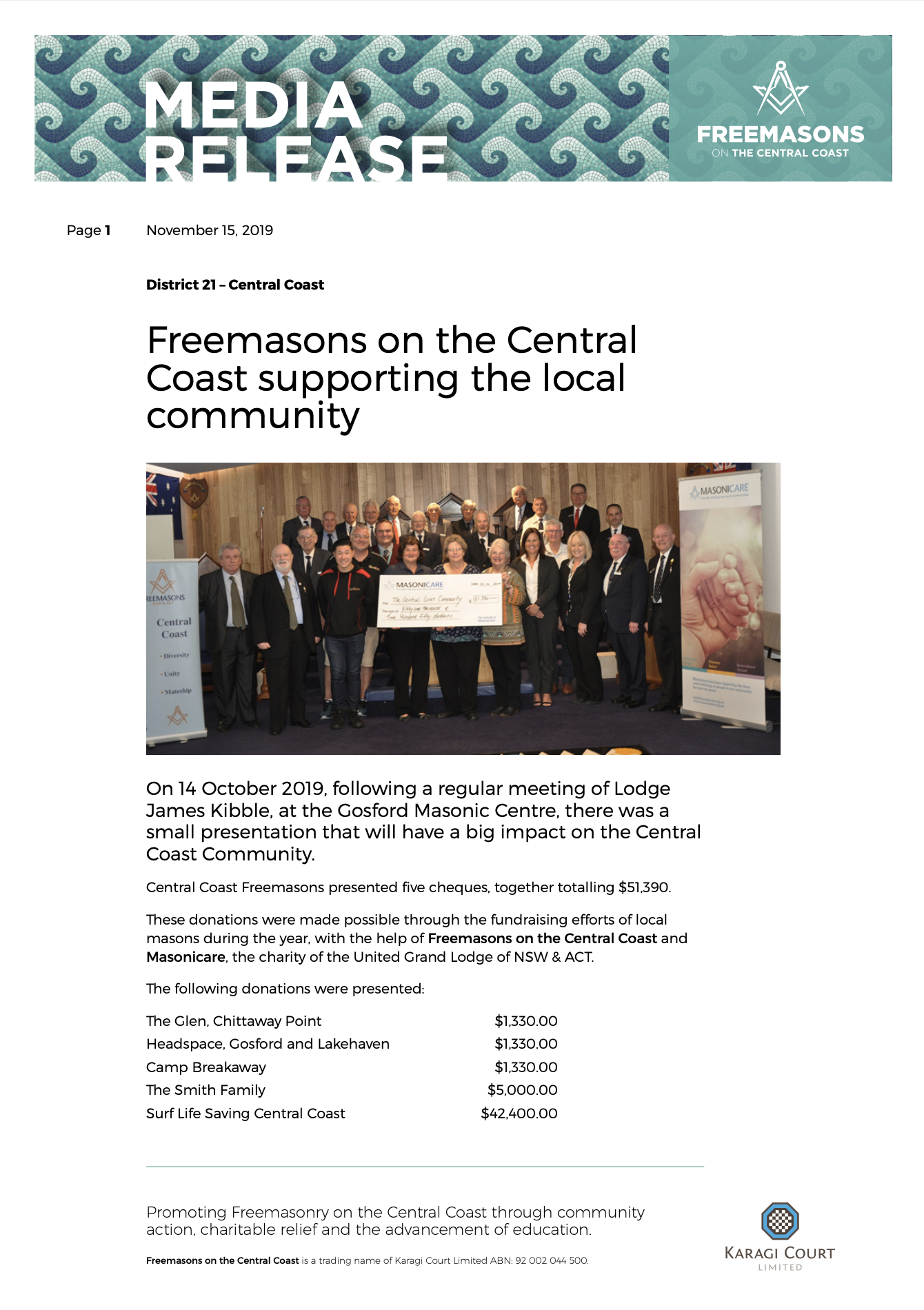 Central Coast Local Health District has a long association with the Freemasons on the Central Coast and we look forward to continuing for many years to come.