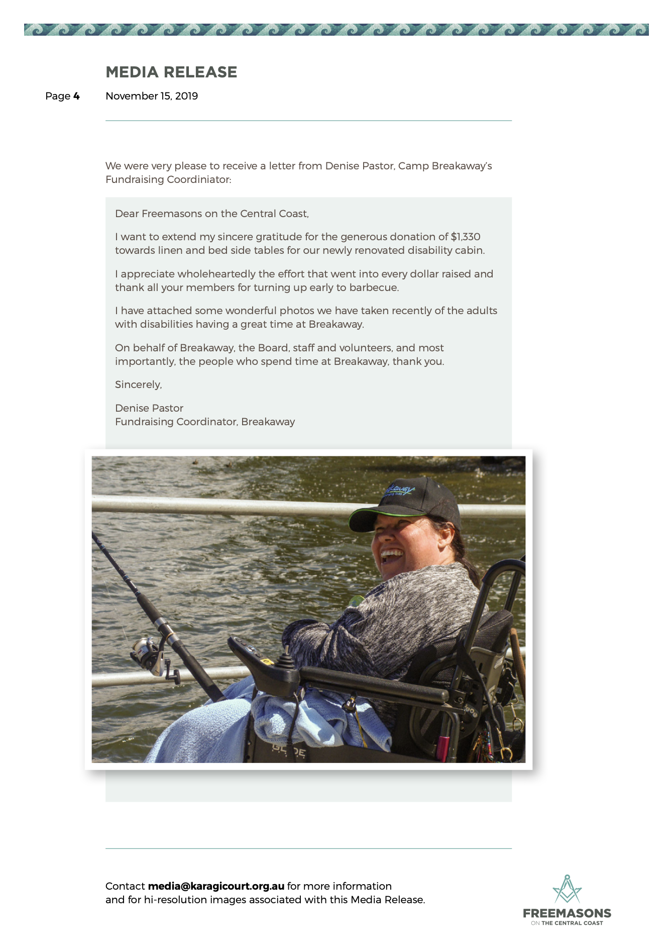 At the Annual Christmas Party for the volunteers assisting at Camp Breakaway, the Freemasons of District 21, together with financial assistance from Masonicare presented a cheque to the value of $ 3,000.00.