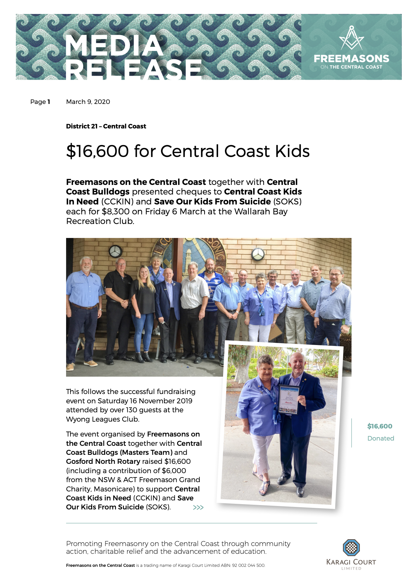 Soks and Soup Drive with the Central Coast Bulldogs. The Soks and Soup is this year’s charity project by the Central Coast Bulldogs. As Freemasons on the Central Coast are sponsors of the club, District 21 decided to assist the members of the Central Coast Bulldogs in their charity drive. The Soks and Soup will be donated to the Shoebox Revolution in early June.